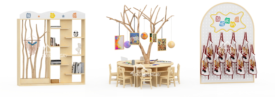 幼兒時期的孩子好奇心強,喜歡探索和嘗試。因此,美術教室的設計應充滿趣味性和啟發性,激發幼兒的學習興趣和創造力。將桌椅、板凳以及燈飾用特殊的造型和質感設計,例如,樹樁造型的椅子,大樹造型的美術桌,展現出趣味性藝術的情境式造型感。給孩子們以耳濡目染,生動有趣的藝術環境。